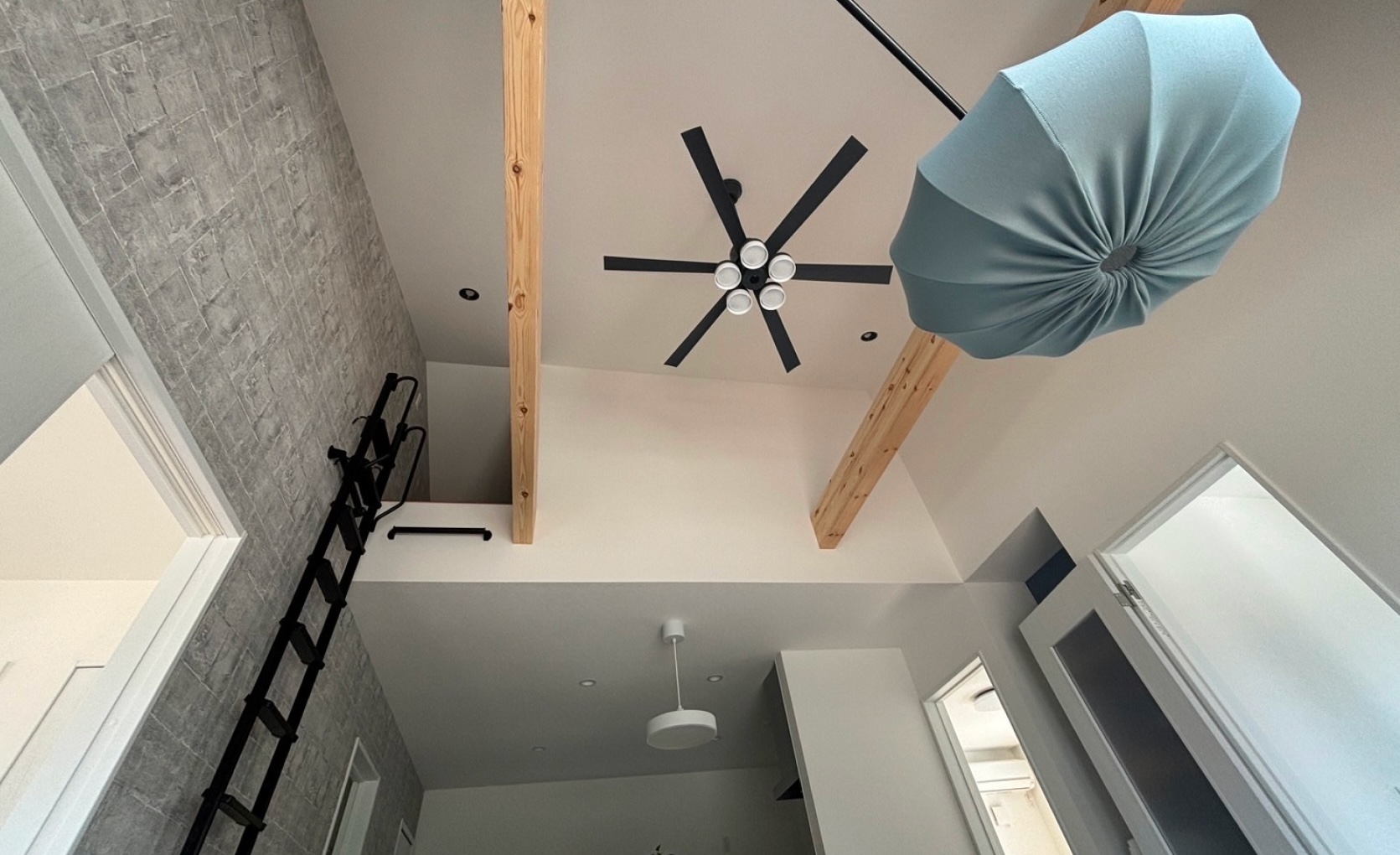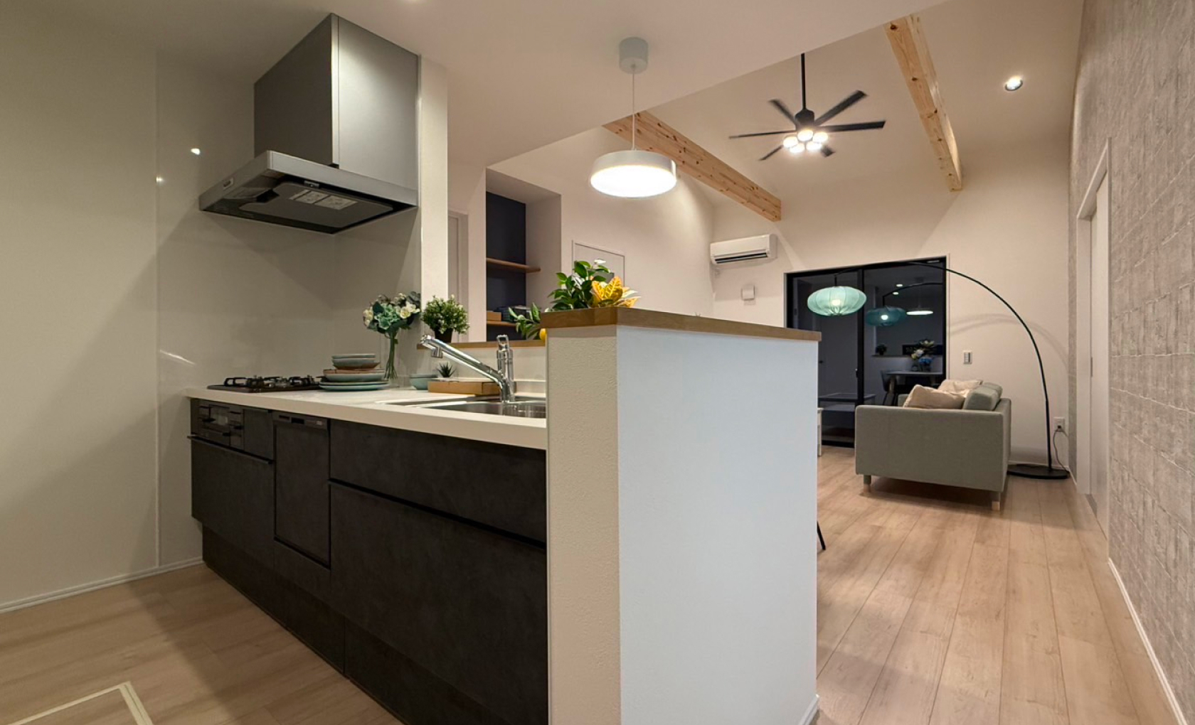 平屋の勾配天井を活かし、空間の広がりと開放感を最大限に引き出しました。大きな窓から光を取り込み、天然木の温かみが家族の団らんを演出します。デザインの力で、家族が自然と集まる居心地の良い空間を提供します。
